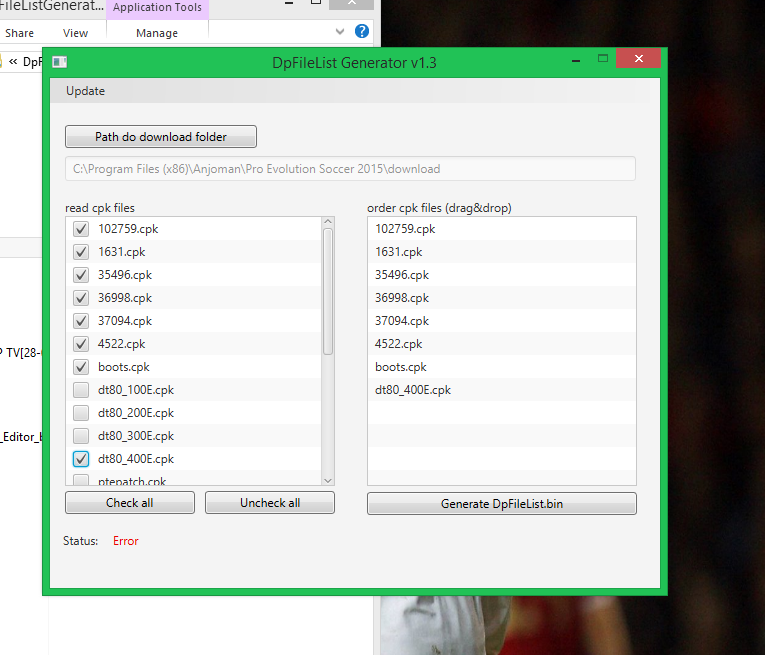 اول با کلیک روی Path To download Folder رو میزنیم مسیر پوشه ی download رو که د محل تصب بازی هست رو انتخاب میکنیم و فیس هایی که تو پوشه ی download کپی کردیم رو تیک دار میکنیم و در اخر Generate DpFileList.bin رو میزنیم دقیقا مثل زیر :